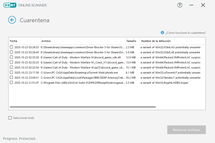 Hola, perdon, hice el analisis y respondi con el log pero por alguna razon parece que no se ejecuto la respuesta, entre para ver y me doy cuenta que no aparece mi respuesta, lamentablemente el log lo borre, pero adjuntare imagen de lo que detecto y envio a cuarentena ESET Online.