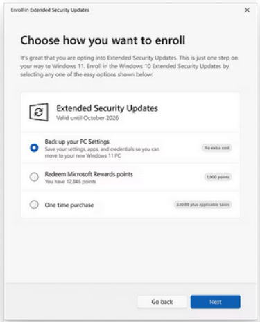 Finalmente he llegado a la conclusión de que la inscripción al ESU a cambio de Reward Points no está disponible en la UEE, así que ya me he inscrito mediante la opción de iniciar sesión con la cuenta de Microsoft, y ayer ya recibí correctamente las actualizaciones correspondientes al mes de noviembre.