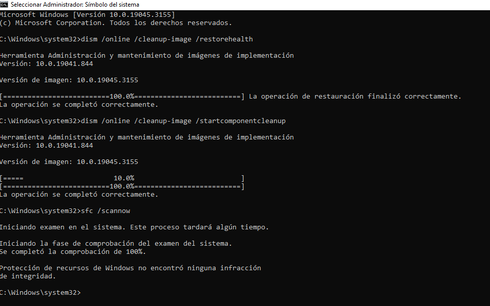 Si alguno te pide reiniciar procedes. Revisa si el ultimo comando te informa si encontró alguna infracción y si la pudo reparar. Si encontró y copia y pega este otro comando: